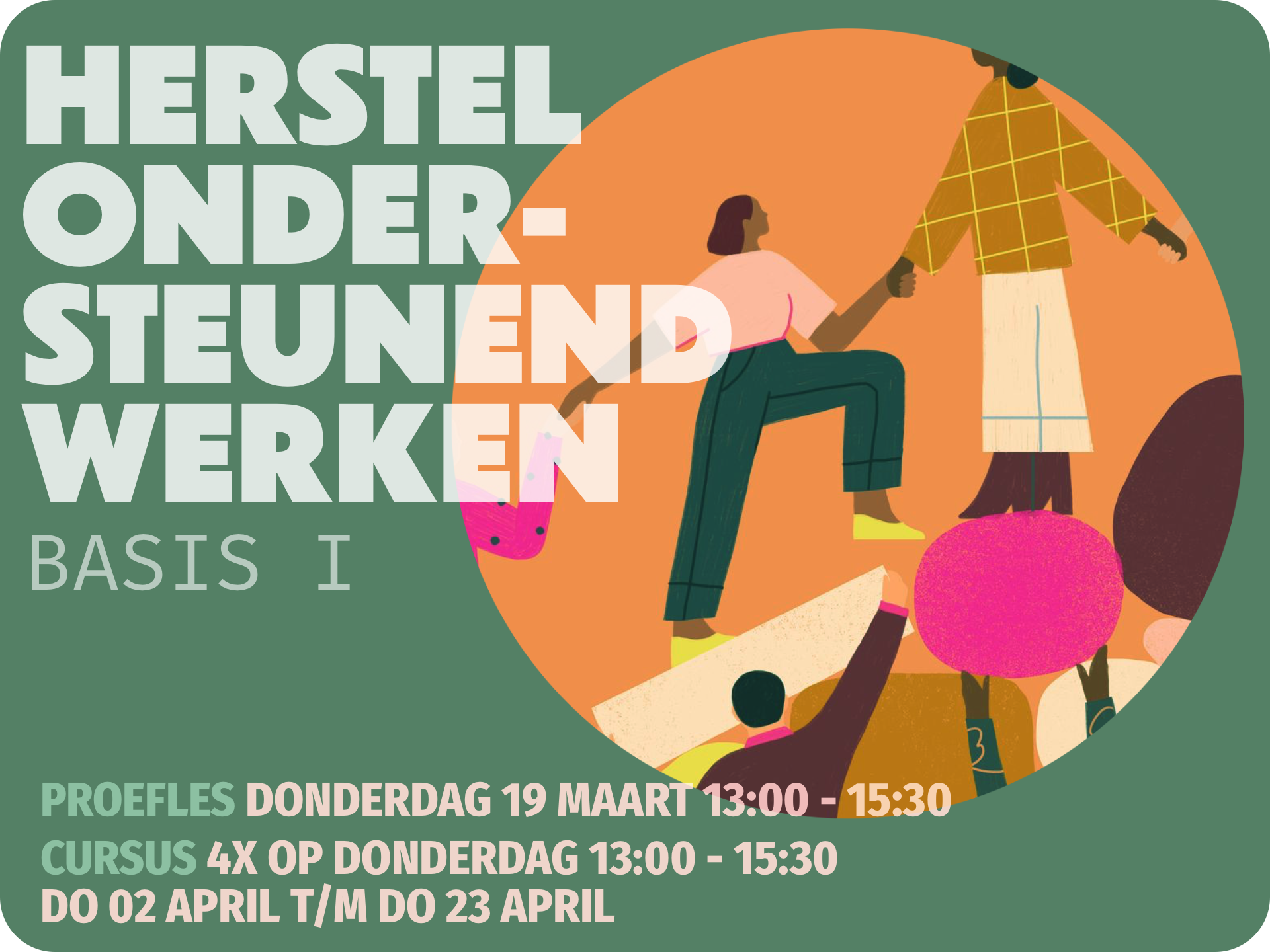 Ben je nieuwsgierig naar een andere manier van werken met mensen, die eigen regie en kracht in plaats van problemen voorop zet? Lijkt het je fijn om vanuit gelijkwaardigheid en met inzet van je eigen ervaringen anderen te ondersteunen? Bij herstelondersteunend werken ligt de focus op het opbouwen van een nieuwe toekomst, kwaliteit van leven en op leren leven met of na ontwrichting. Vrije ruimte en eigen regie zijn belangrijke aspecten: je leert om naast iemand te staan zonder de ontwikkeling van de ander te sturen of de verantwoordelijkheid over te nemen.